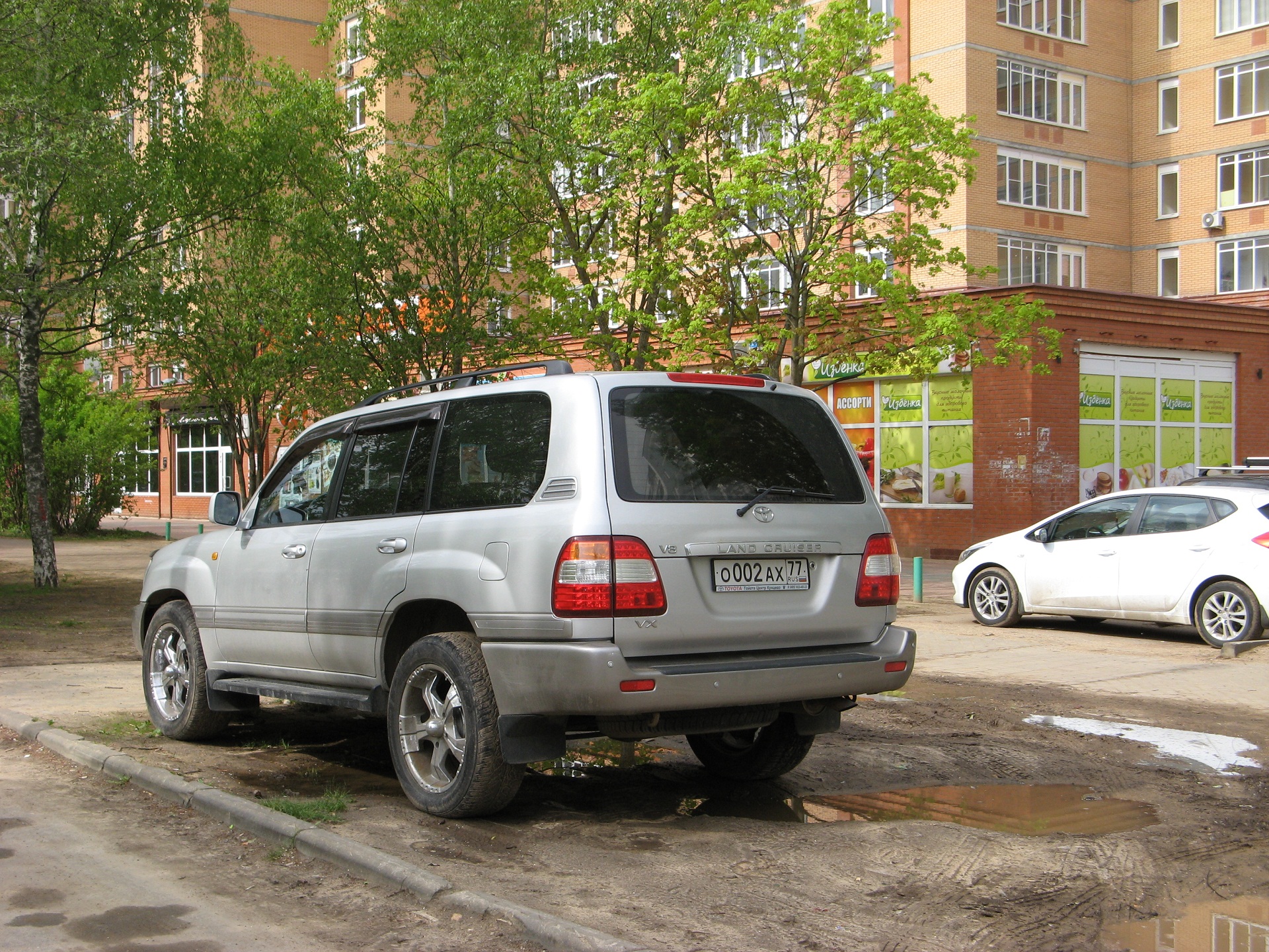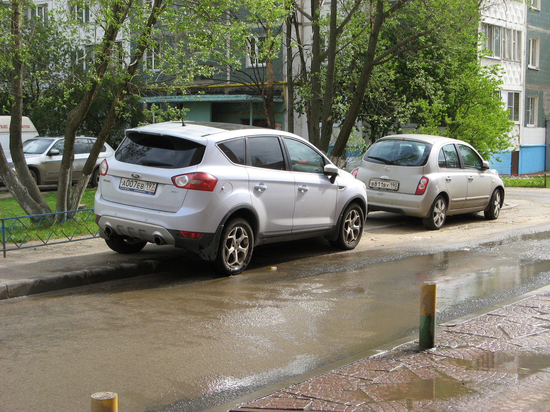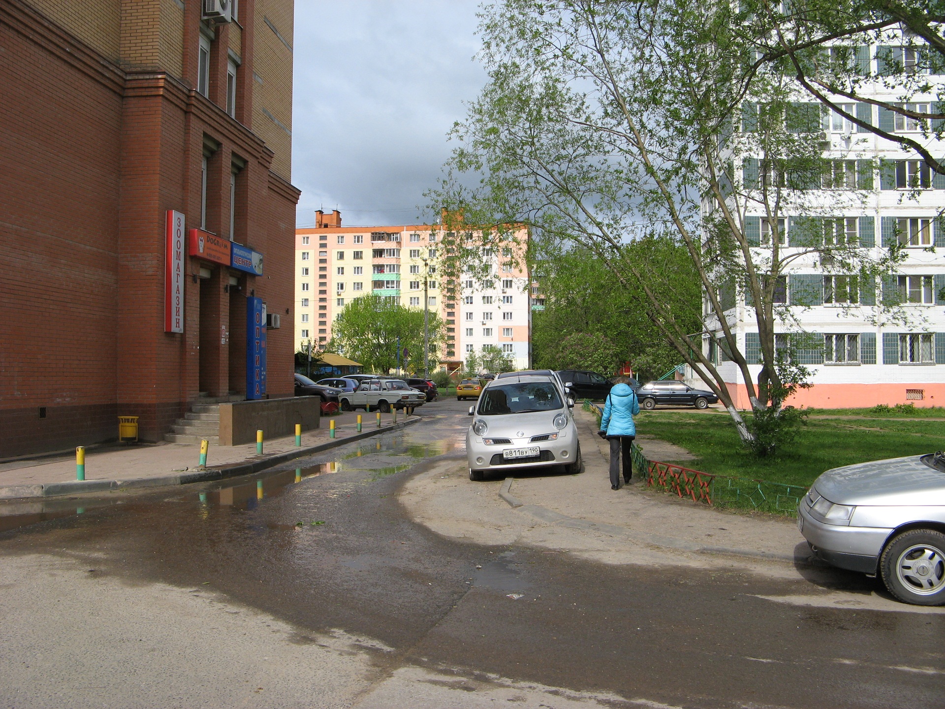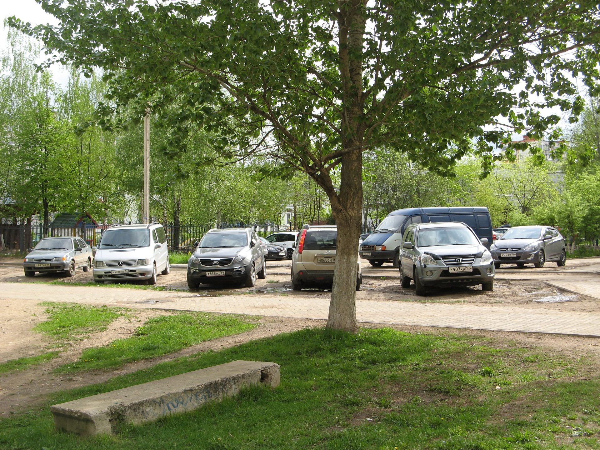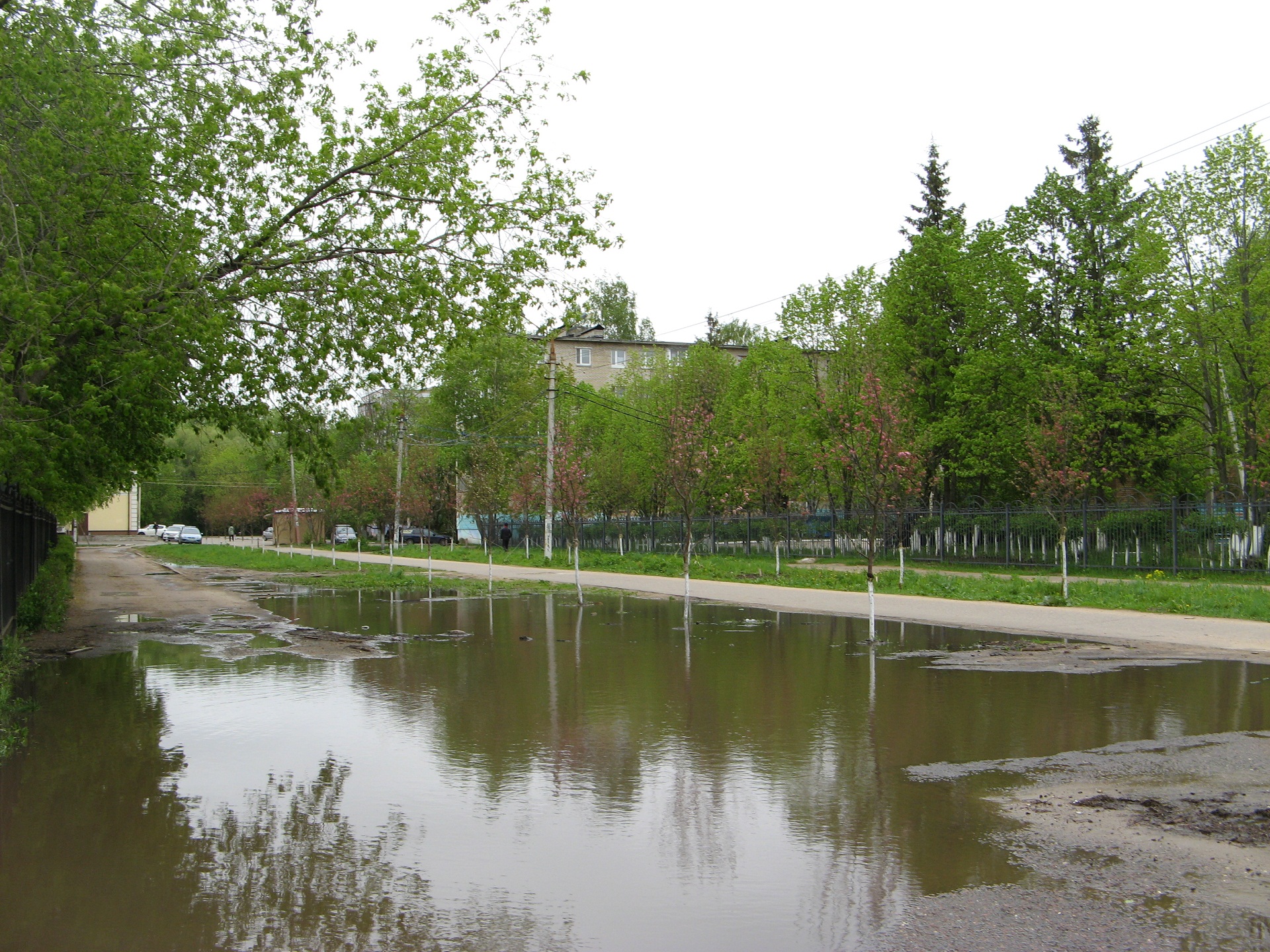 Вечная лужа возле шк.9, заезженный машинами газон. Яблони цветут - должно быть красиво, а вокруг срач.