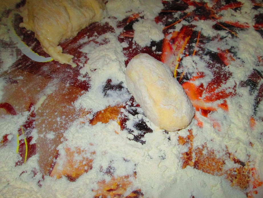 Можно немного ещё скатать для плотности нарезанные кусочки. Ну обваливаем в муке, чтоб не липли...