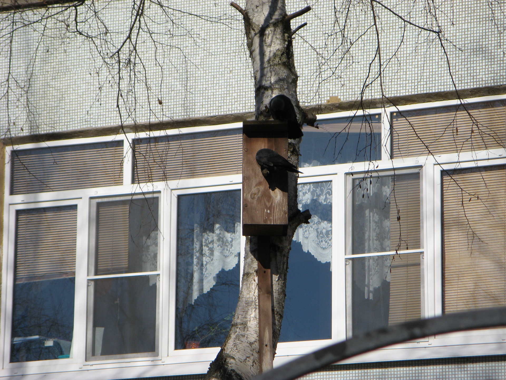 Грачи прилетели и заняли гнёзда галок. галки пытаются осваивать скворечники :D