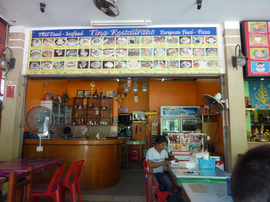 а по кафешкам - поскольку мы жили рядом с ночным рынком, то по понедельникам и четвергам ужинали там же жареными на гриле креветками и морским окунем в соли, а в остальное время в основном питались в кафе, рядом с Катой (см.карту), в частности кафешка крайняя слева (из шести) - вежливое обслуживание, вкусные блюда и неизменный десерт в подарок и другие приятные ништяки. Это одно из немногих мест, куда хотелось возвращаться вновь и вновь, что мы собственно и делали. Ежели забредете туда, рекомендую рис в ананасе и жареные креветки с чесночным соусом, а также все остальные традиционные тайские блюда. :mrgreen: цены в меню от 70 бат (рис с креветками и овощами :Yahoo!: )