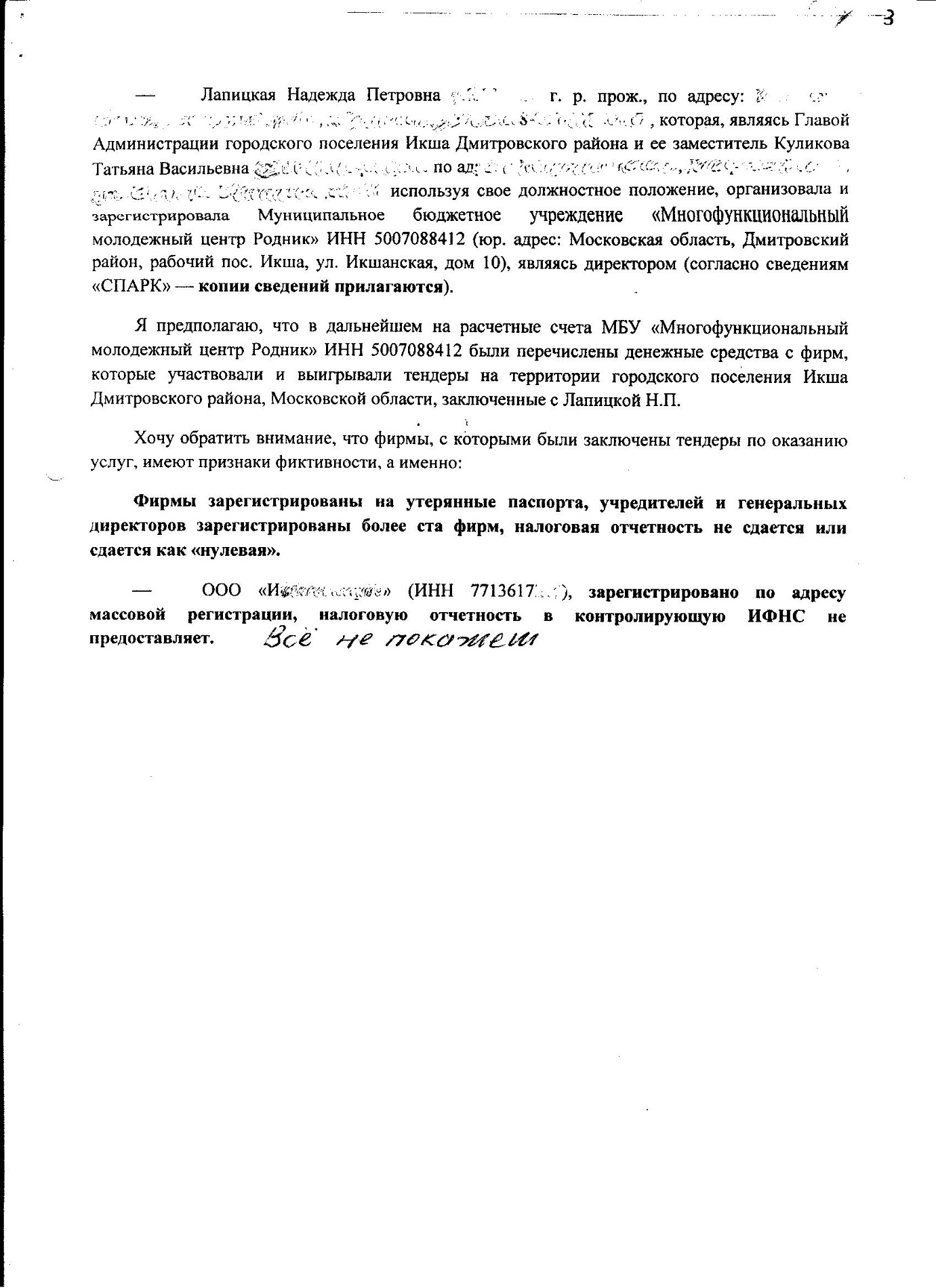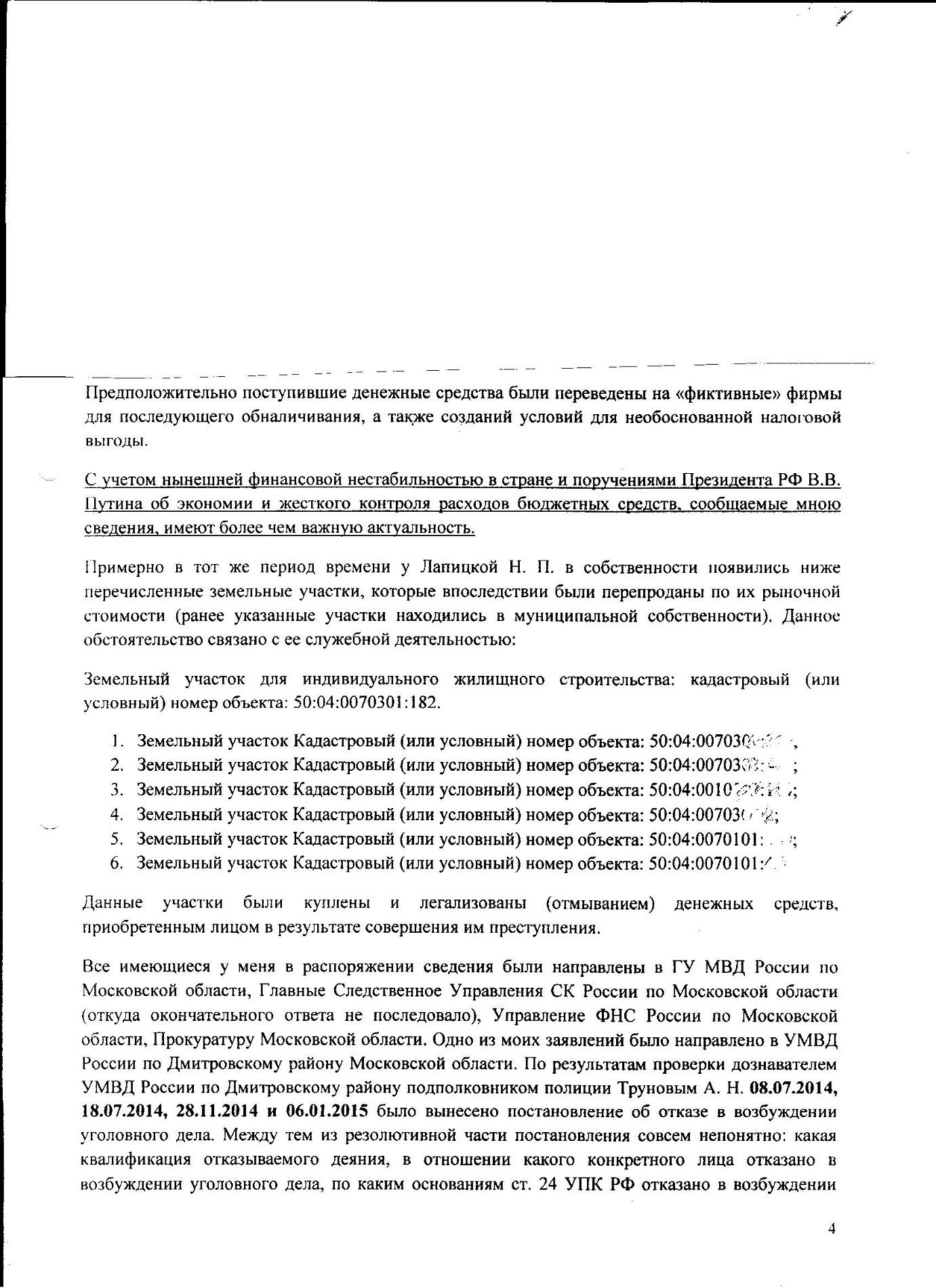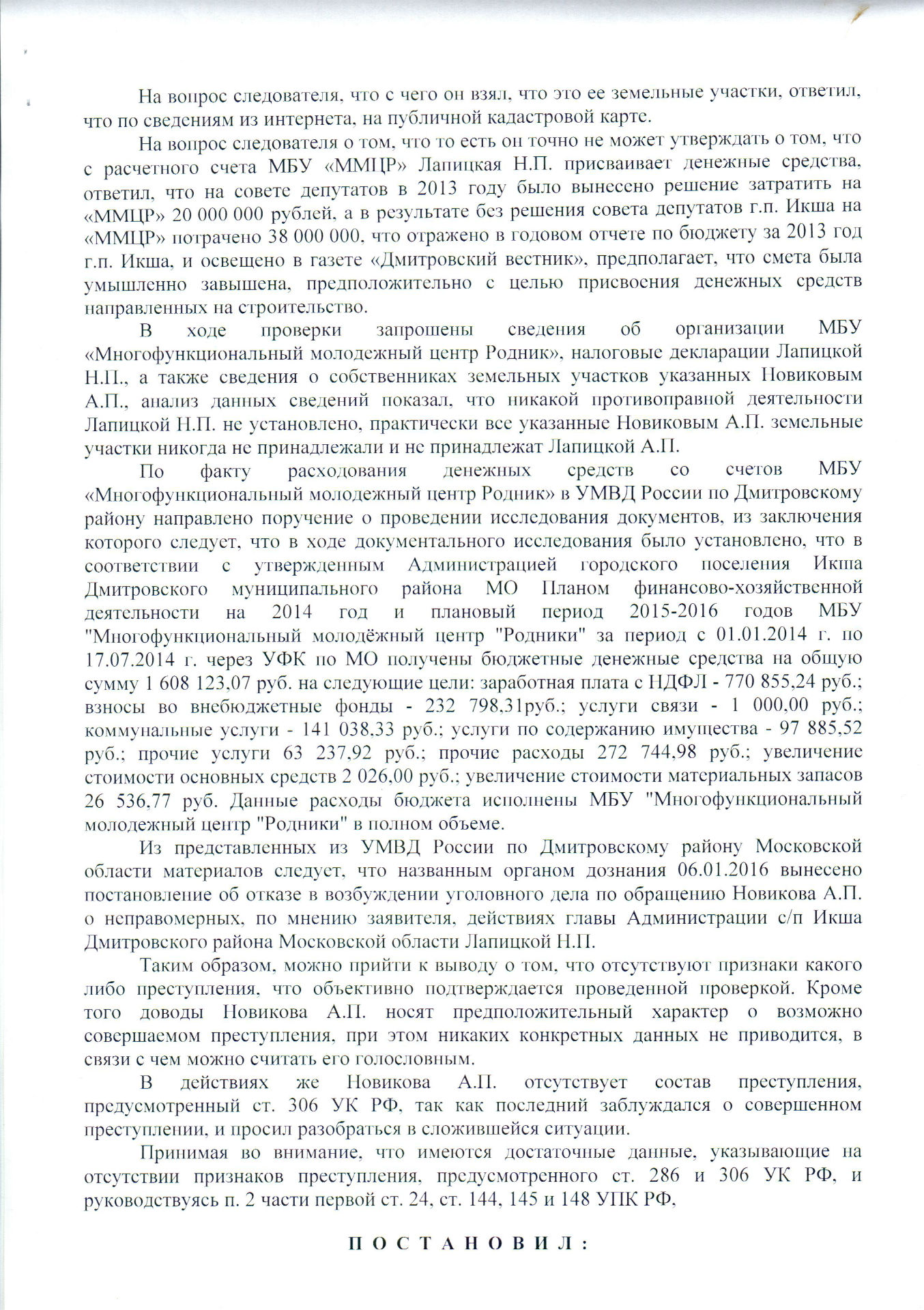Ранее было возбуждено уголовное дело на Лапицкую Н. П. в 2009г. Следственный комитет Дмитровского района в лице Д.В. Россикова дал ответ: отказ в возбуждении уголовного дела в связи с истечением срока давности, также пишет, преступлением является только даяние в крупном размере, которым признается сумма бюджетных средств свыше 1 500 000 руб., притом просто рядовой гражданин за кражу пакета картошки получает реальный срок!