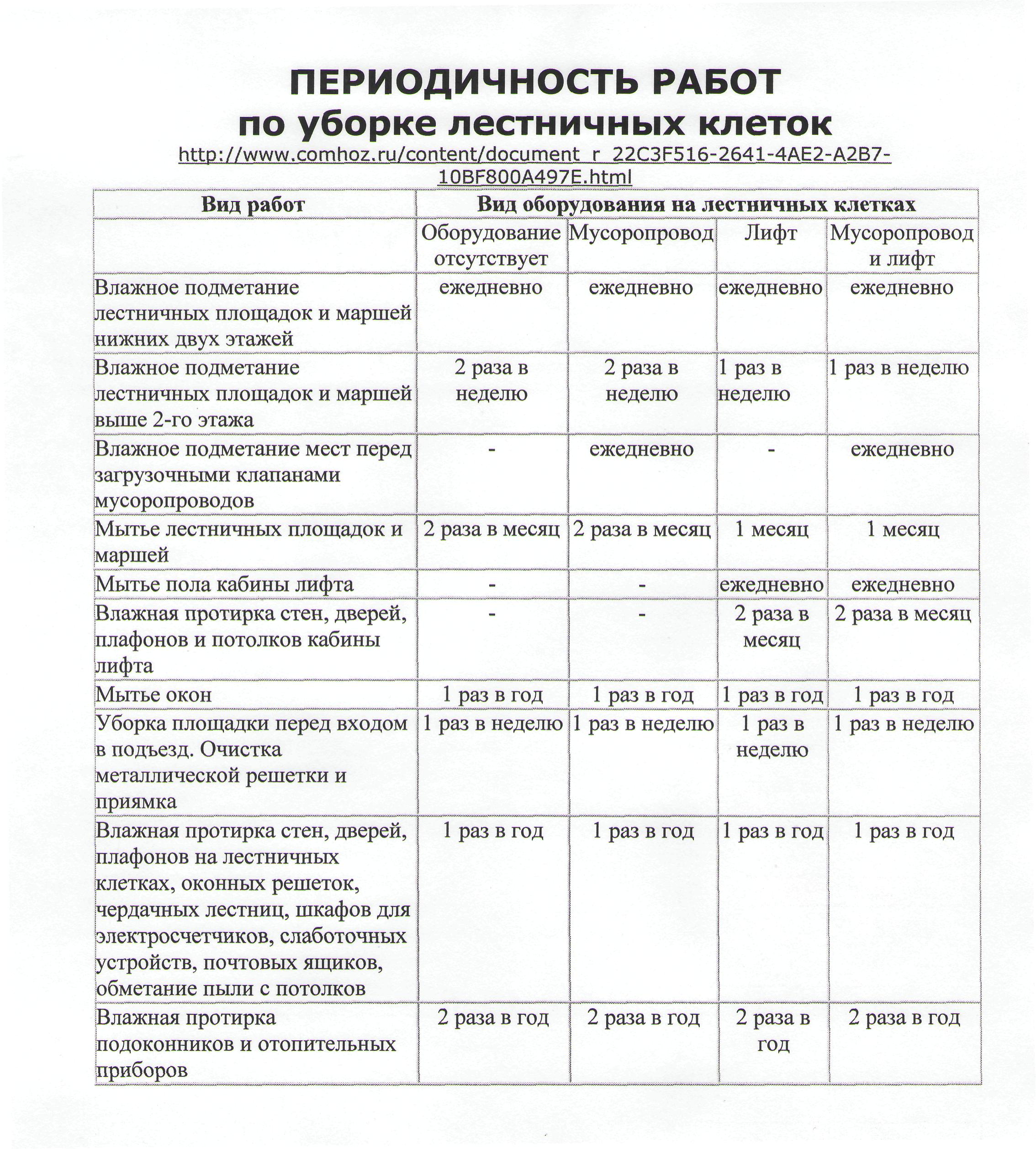 Этот документ четко определяет периодичность, с которой уборщица обязана подметать подъезд, мыть лестничные марши, наводить порядок на площадках перед мусоропроводом, ухаживать за помещением лифта, протирать подоконники, окна и плафоны.