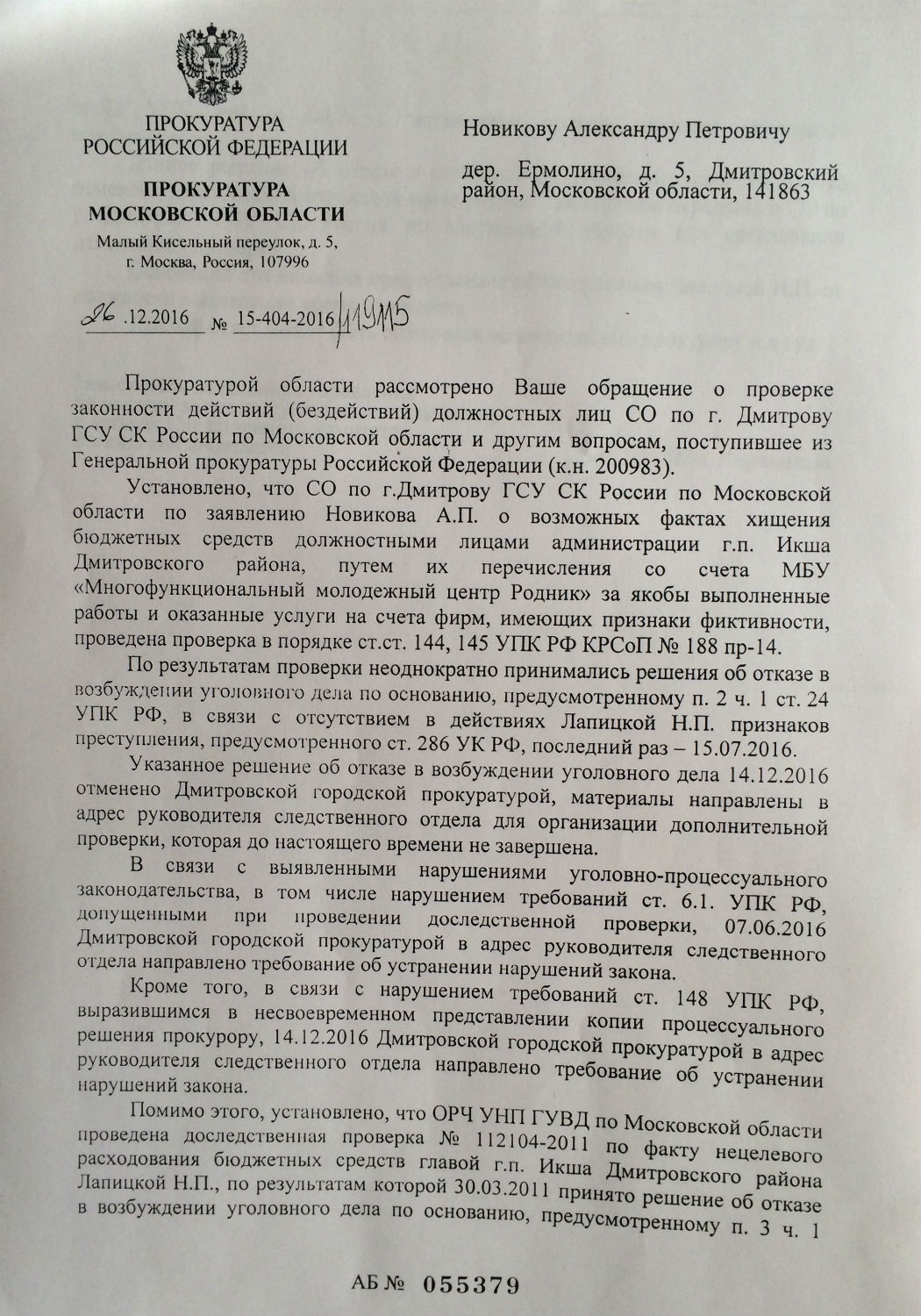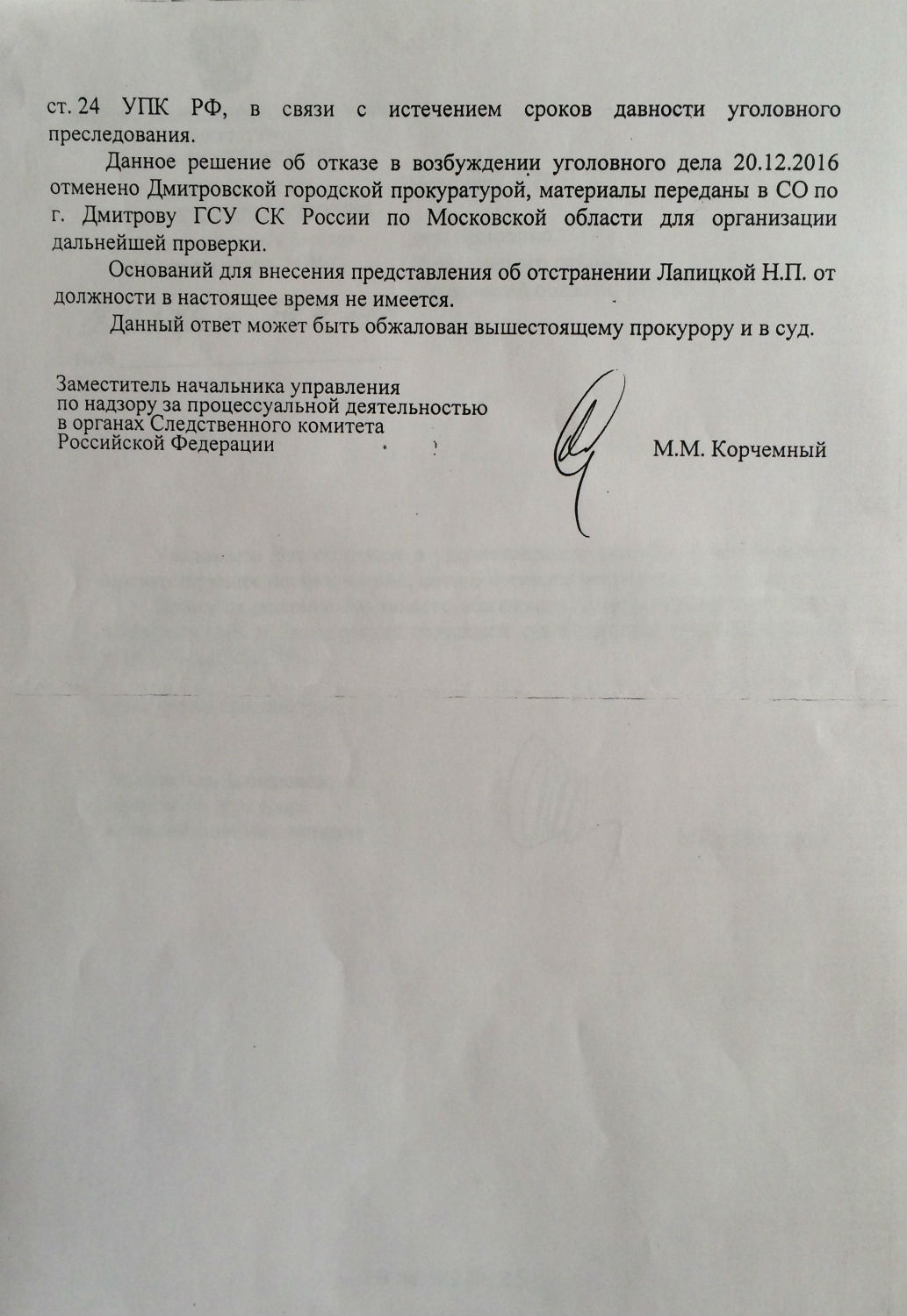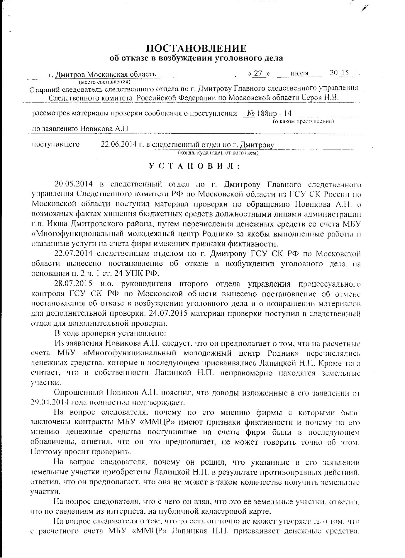 Ранее было возбуждено уголовное дело на Лапицкую Н. П. в 2009г. Следственный комитет Дмитровского района в лице Д.В. Россикова дал ответ: отказ в возбуждении уголовного дела в связи с истечением срока давности, также пишет, преступлением является только даяние в крупном размере, которым признается сумма бюджетных средств свыше 1 500 000 руб., притом просто рядовой гражданин за кражу пакета картошки получает реальный срок!