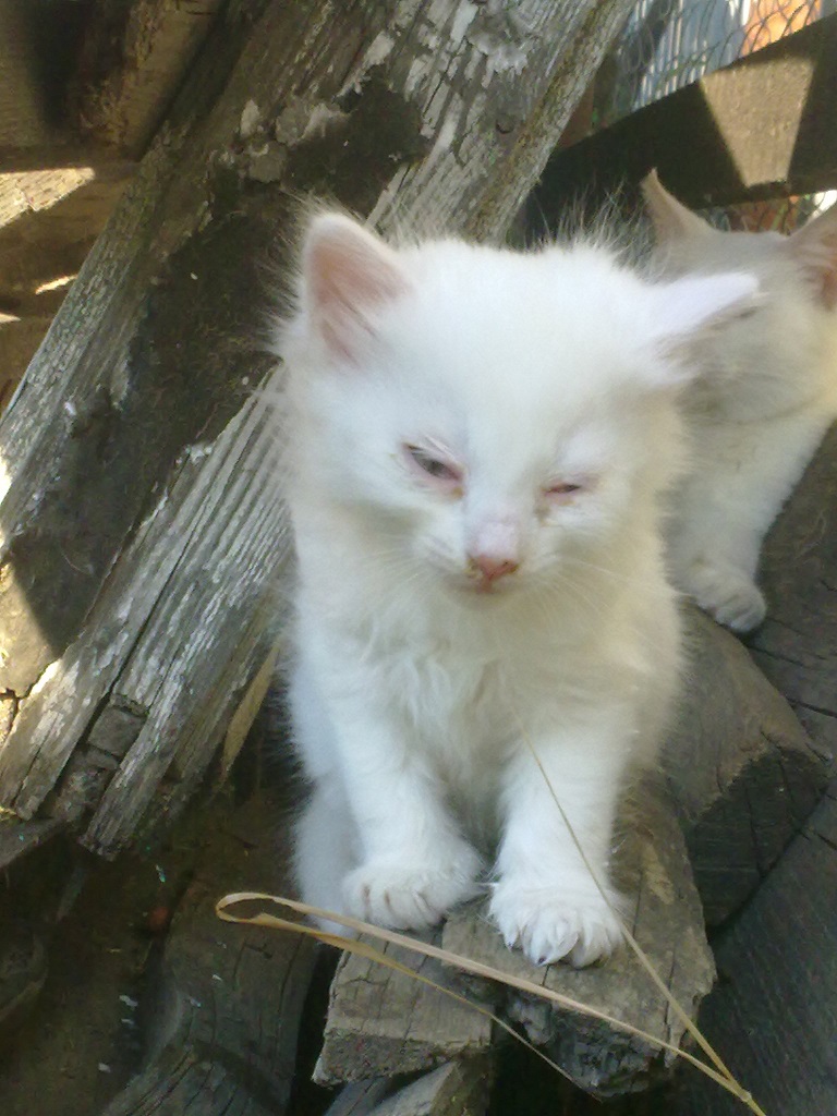 У нас на участке объявилась кошка с 4 маленькими котятами. Место себе они нашли среди досок, которые свалены возле забора. Кошка абсолютно белая, похоже раньше у кого то жила, так как не боится людей и очень любит ласкаться. Один котенок дымчато-черный, трое других полностью белые с голубыми глазами. Двое белых котят боятся людей и постоянно прячутся среди досок и не показываются от туда. Черный и один белый наоборот подходят и их можно погладить. У этого белого котенка похоже больные глазки, у черного один глаз или еще не открылся или тоже больной. Может кто знает, чем можно протирать котятам глаза, а то я с этим никогда не сталкивался и уж очень они мелкие, наверное недели три котятам. Сами еще не едят, только молоко у кошки сосут. Кошку как обнаружили на участке, стали раз в день подкармливать. Даем сухой корм и молоко, которое она похоже просто обожает. Когда котята подрастут встанет еще одна проблема, куда их девать. А то если выживут, так как настанут холода, то станут наверное дикими. Может кто возьмет себе таких очаровашек? :D