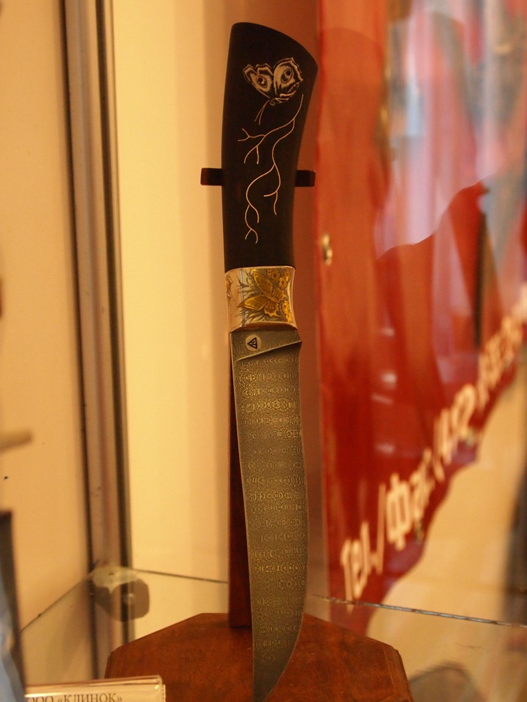 Спасибо Карла. Это фотографии с нескольких выставок. Вообще-то по составу участников они отличаются. Например выставка "Арсенал" более направлена на художественную часть изделия, а "Клинок" на утилитарность. На обеих выставках вас могут научить правильно точить и править ножи, на "Клинке" также научат метать клинки, на нём же проводятся мастер-классы по готовке с помощью ножа какой-либо мастерской. Меня например поразил повар, который с помощью шеф-ножа фирмы "Булат", практически несколькими лёгкими движениями отрезал кусок туши ягнёнка и тут же приготовил мясо. Причём сложилось впечатление, что нож не встречал сопротивления перерезая кости.