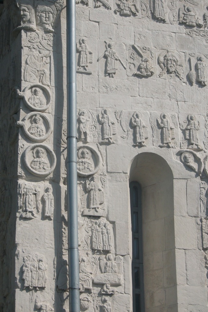 Церковь Покрова на Нерли как и храм в Юрьев-Польском украшена резьбой по белому камню. Стены храма украшены фигурами мифологических существ, а также женскими лицами выражающими разные чувства: доброту и злость, наивность и гордость.