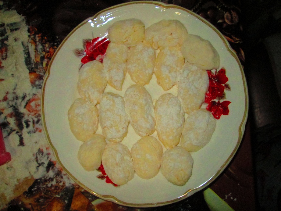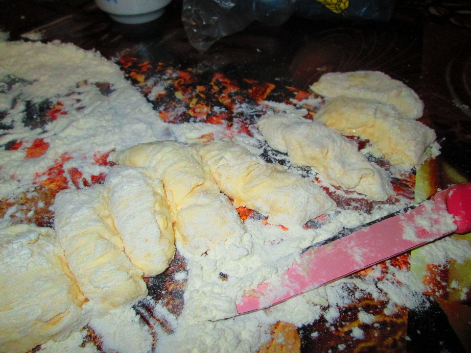 Можно немного ещё скатать для плотности нарезанные кусочки. Ну обваливаем в муке, чтоб не липли...