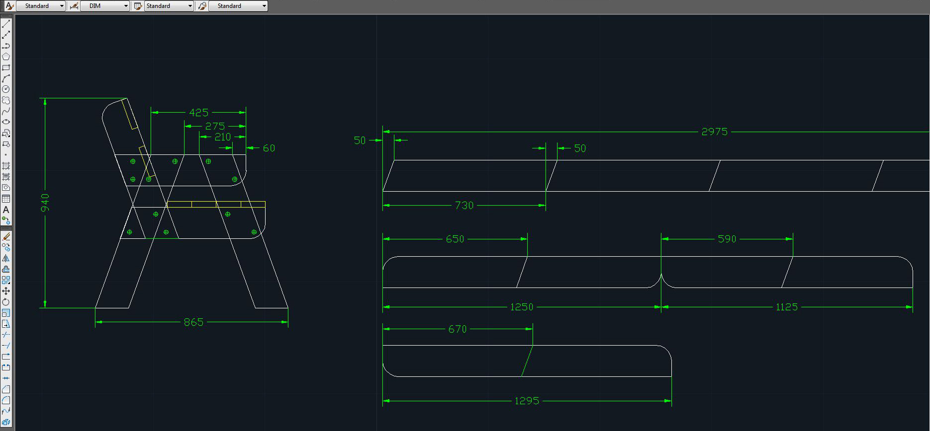 Чертеж распечатан на принтере, в уменьшенном масштабе и перенесён на картон, далее был выполнен 3D макет лавочки, чтобы предотвратить возможные «недодумки» (материал недешёвый, не хотелось ошибиться). В моём случае это быстрее и надёжнее, чем вытягивать 3D модель в Автокаде.