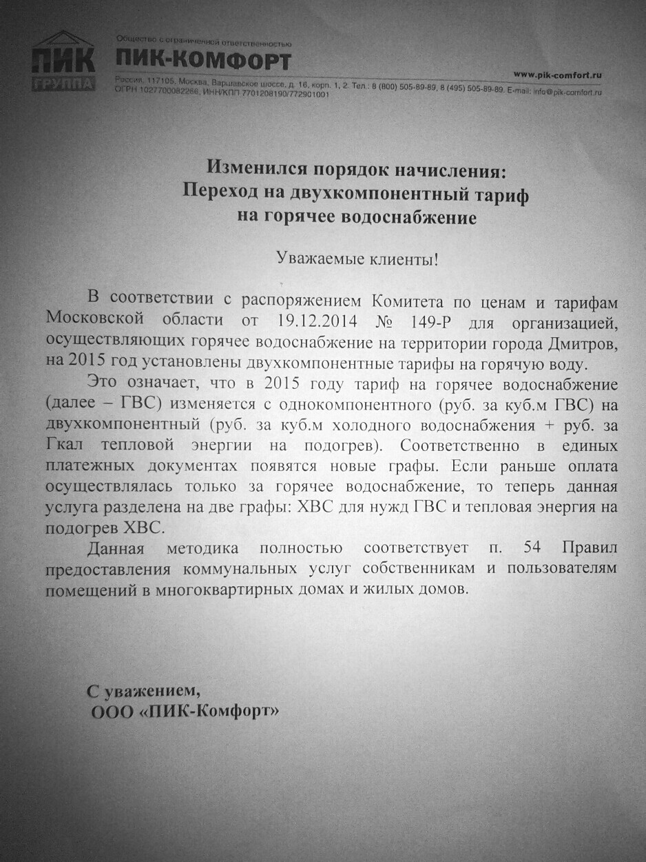 Про ПИК тут, конечно, ни слова. Этим распоряжением устанавливается стоимость тепла от Дмитровтеплосервиса.