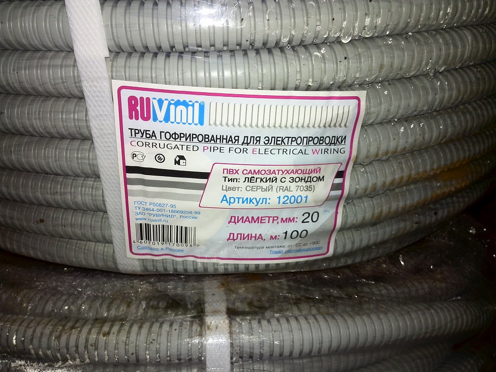 Есть несколько бухт по 100 метров, диаметр 20 мм, цвет серый, с протяжкой.