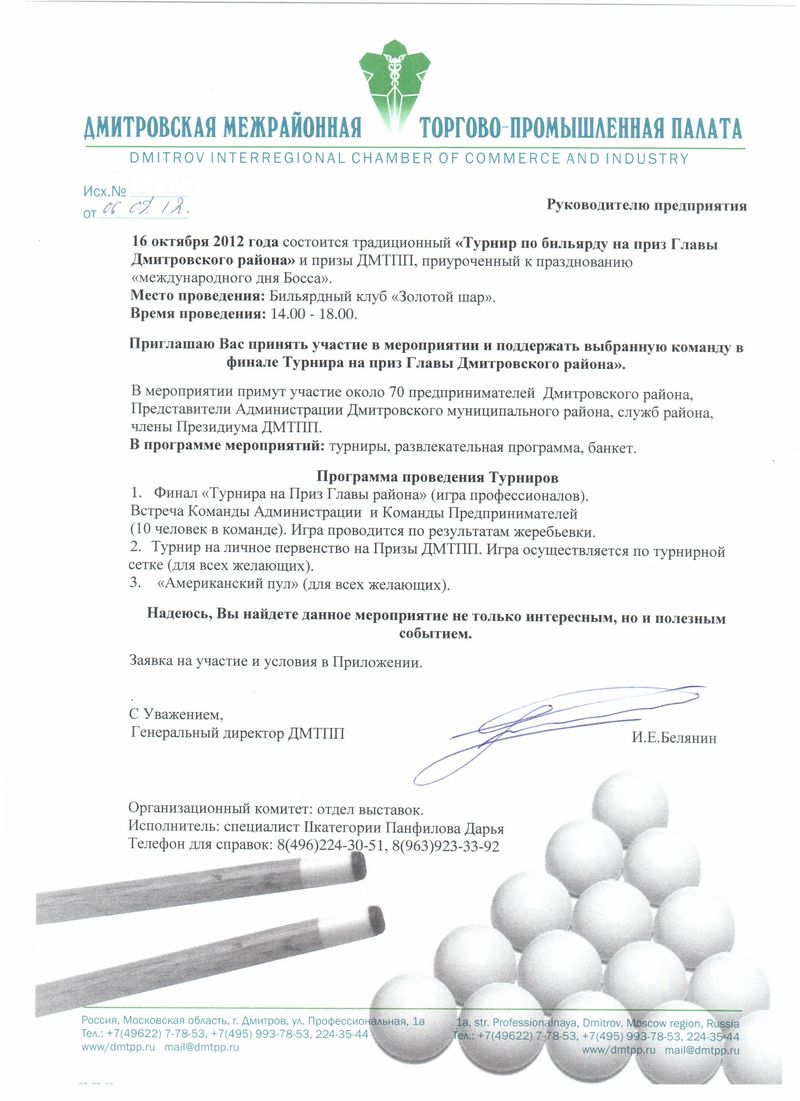 - Это из ДМТПП, мы приглашаем Вас на бильярдный турнир на приз главы Дмитровского района.